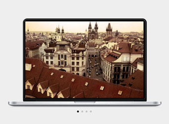 Simple variation of image slider with bullets is used, image behind scales with slider automatically.